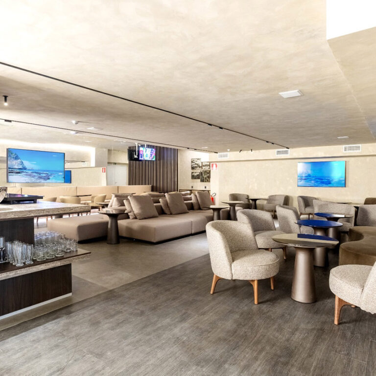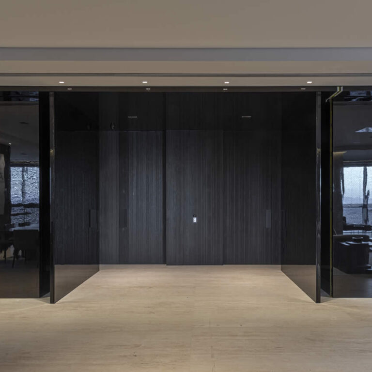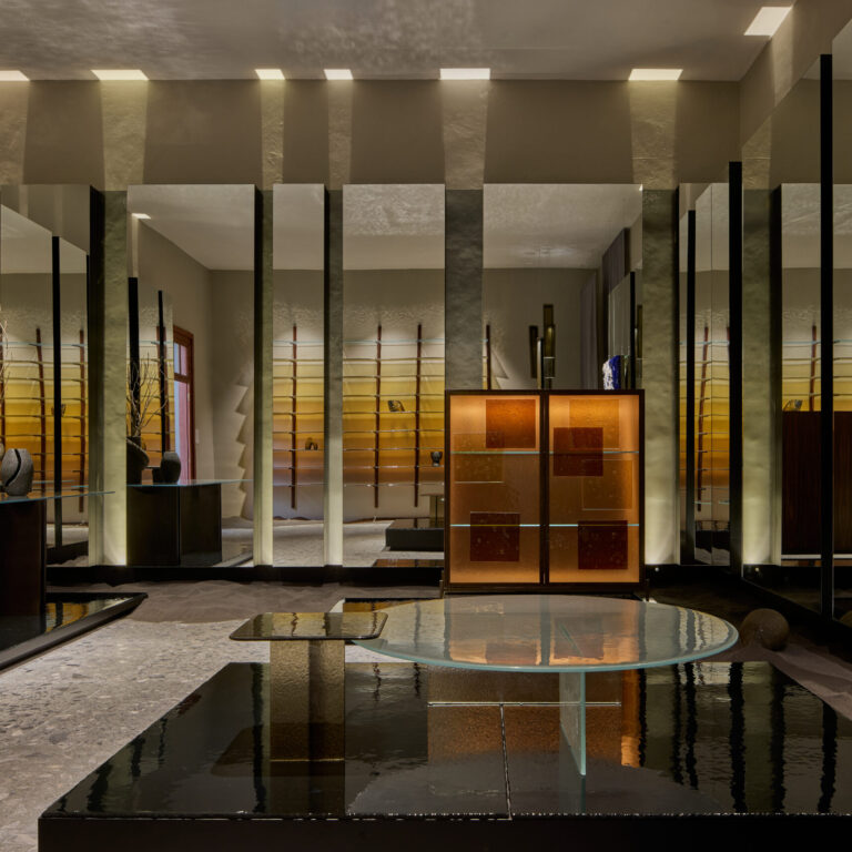 As bases em vidro fusing preto com borda iceberg, atuam como planos reflexivos que remetem a um espelho d’água. Sua profundidade e acabamento criam a sensação de flutuação do mobiliário sobre ela. Além do aspecto sensorial, reflete no teto a projeção mapeada da luz, reforçando o efeito visual de água em movimento.