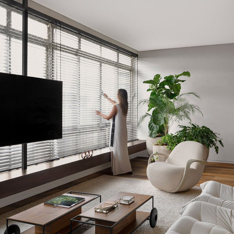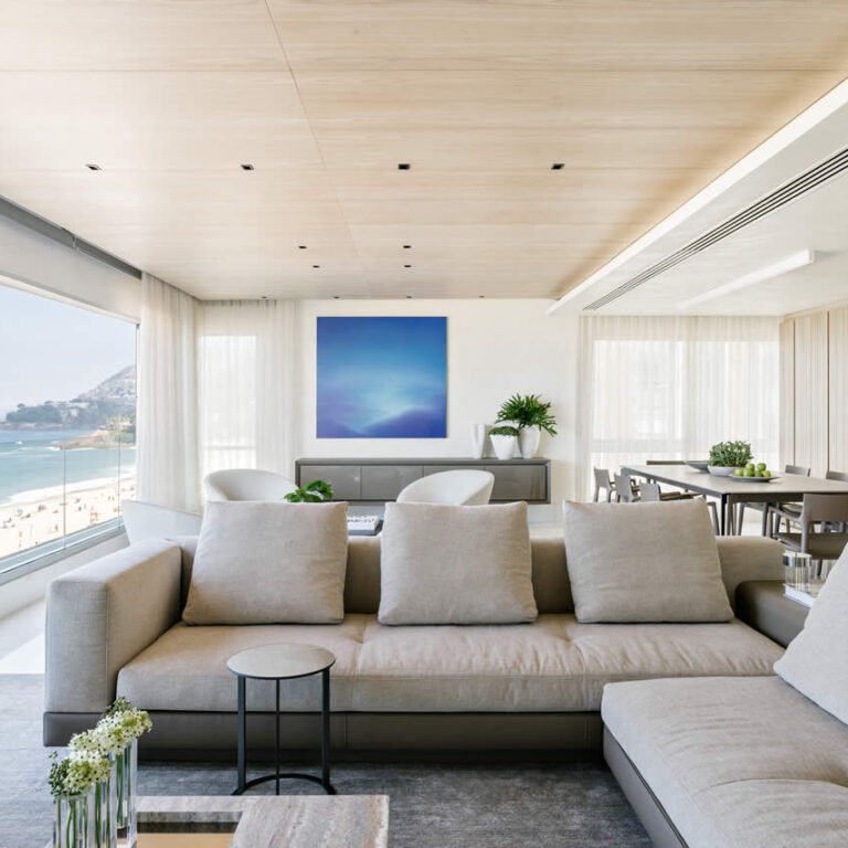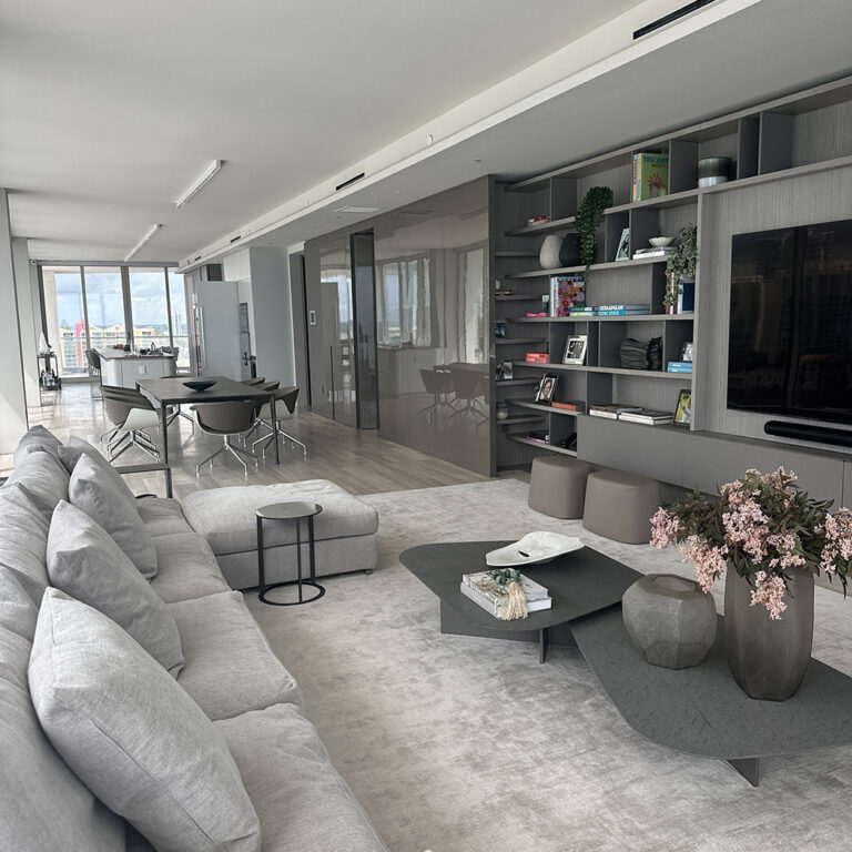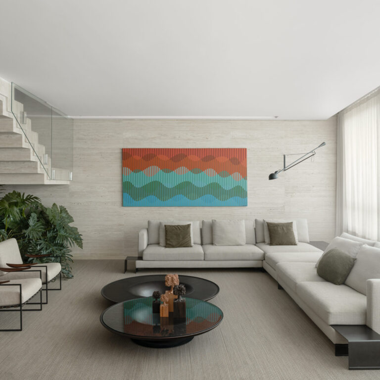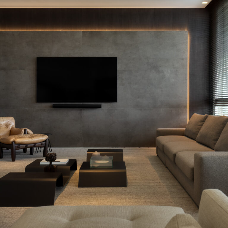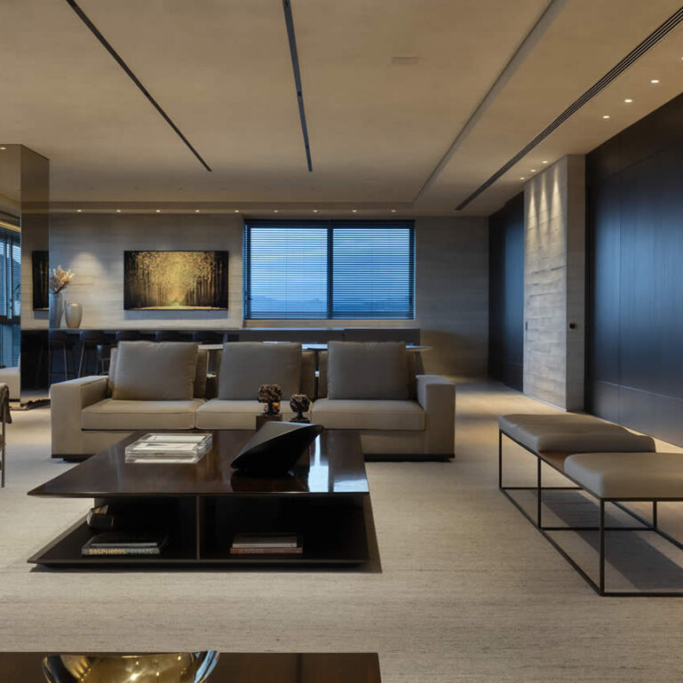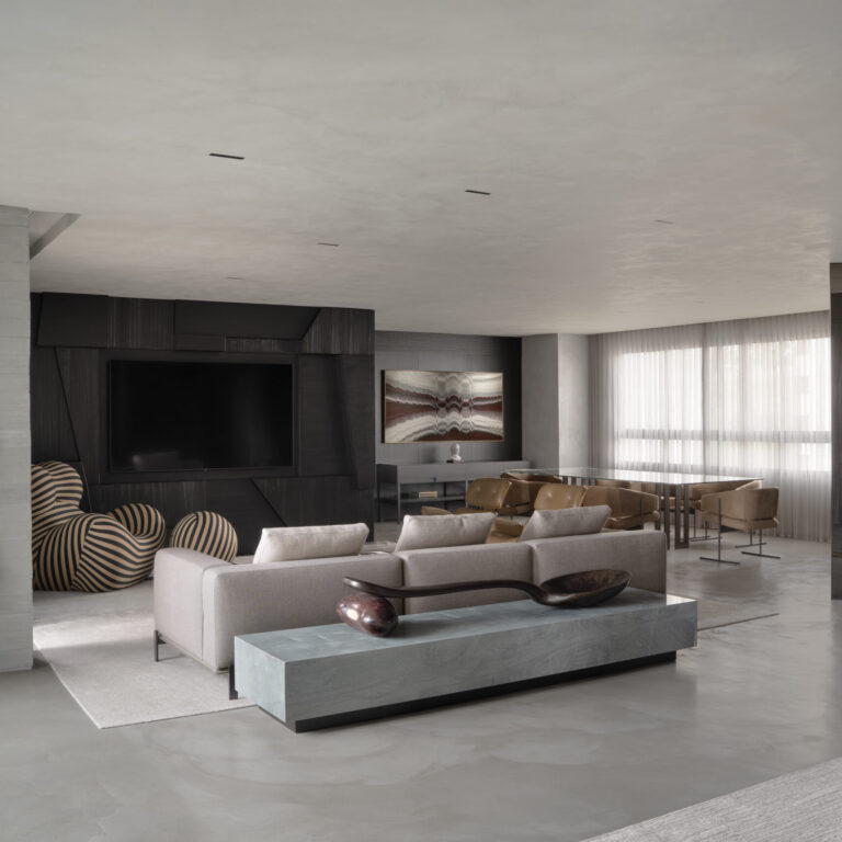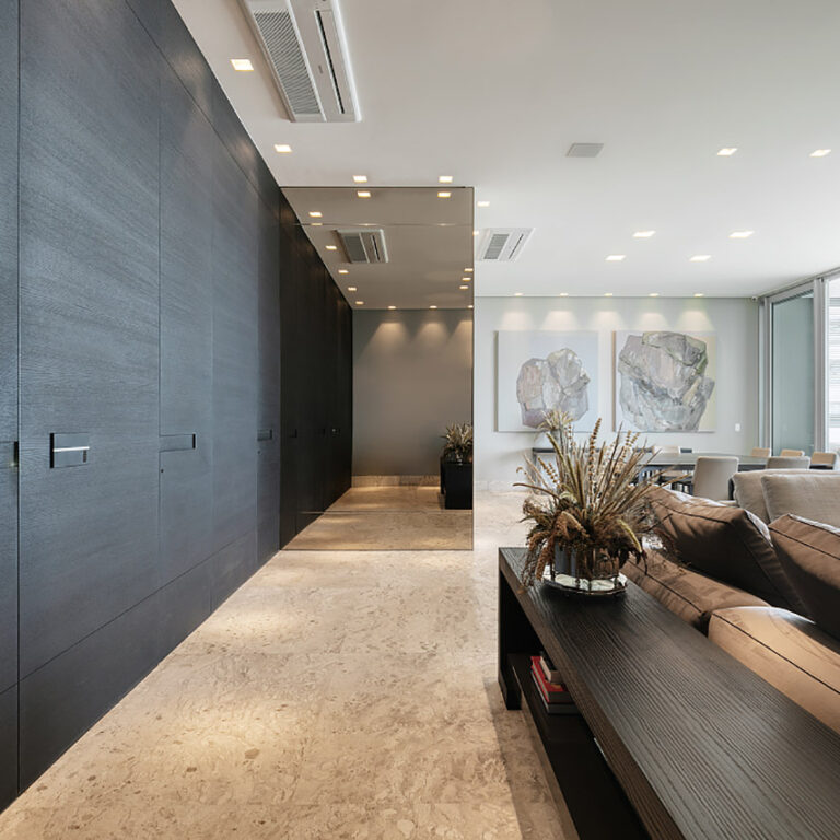 Os painéis de espelhos foram rigorosamente dimensionados para manter as proporções do ambiente. Posicionados de forma estratégica, ampliam a percepção espacial, criando profundidade e continuidade. Além de refletirem e valorizarem o mobiliário, reforçam simbolicamente o conceito da arquitetura: refletir quem habita.